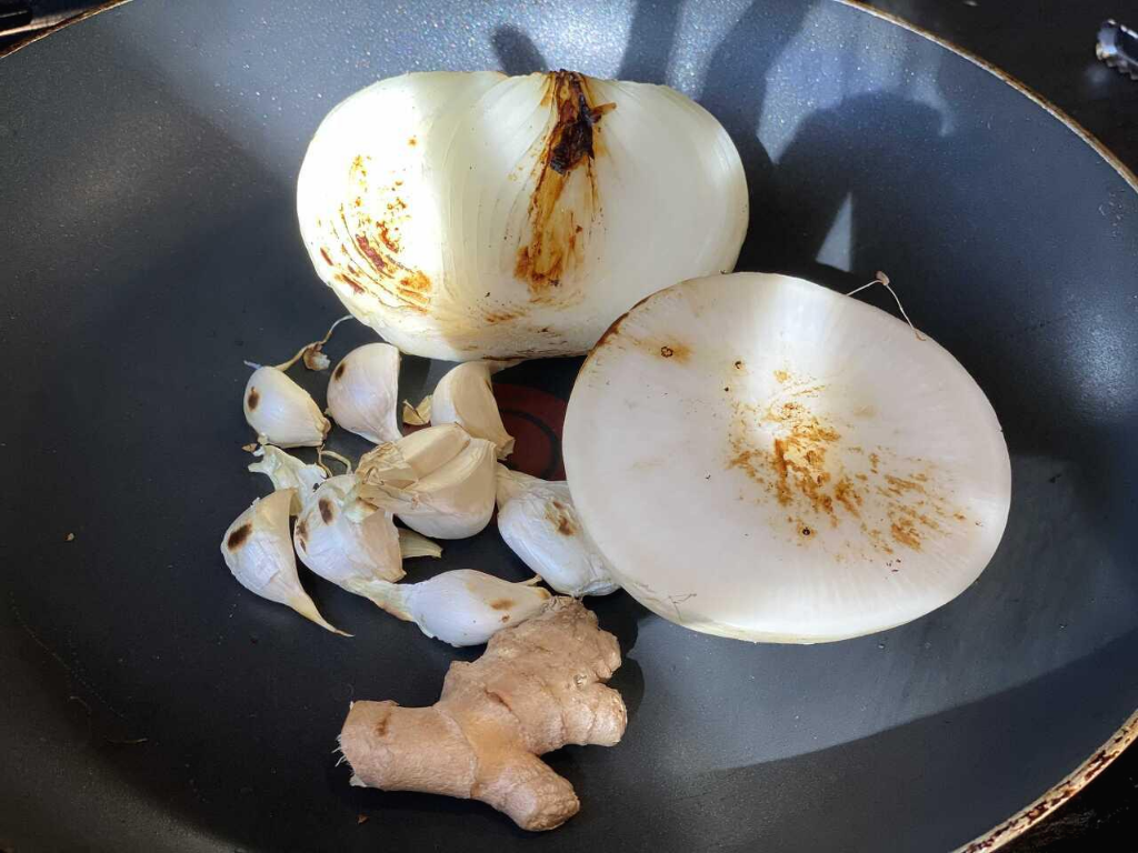 2. 양파, 마늘, 생강을 기름 없이 후라이팬 센 불에서 구워 줍니다. 야채 향이 그윽하네요. 깊은 맛이 기대 된다는...ㅎㅎ