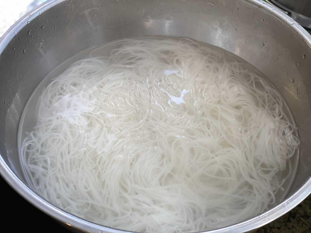 13. 물을 끓여 쌀국수 면에 부어서 약1분 정도 불려 주세요. 기호에 맞게 더 두셔도 됩니다. 체에 면을 걸러 물을 빼고 그릇에 적당히 담아 주세요.